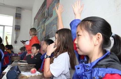 圖為希望小學(xué)學(xué)生幫助法國(guó)小伙伴搬行李