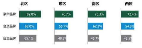 從調(diào)研深入的159座城市劃分的四大區(qū)域看,可以明確從不同區(qū)域各品牌類型 NPS 的得分看出,各區(qū)域豪華品牌 NPS 得分明顯高于合資和自主品牌,而合資和自主在各區(qū)域的服務(wù)水平相對穩(wěn)定,北區(qū)均表現(xiàn)較好,西區(qū)均表現(xiàn)較差,自主品牌整體服務(wù)水平更是低至43.5%。;而豪華、合資和自主品牌在各區(qū)域間 NPS 得分均有較大差異,分別為 10.4%、13.2%和 21.6% 。另從(圖3)顯示的一至四線城市的結(jié)構(gòu)劃分出的各類品牌在各城市 NPS 的得分來看,豪華品牌和自主品牌對于服務(wù)水平的渠道下沉側(cè)重明顯,而合資品牌則相對趨同。