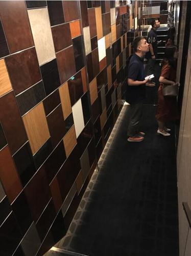 午餐后,順著蜂巢馬賽克臺階,我們來到品牌體驗(yàn)空間的地下酒窖。從一樓向地下室樓梯的墻面,不再是汽車零部件浮雕,而是貼滿了各色、各種材料的雷克薩斯內(nèi)飾面板。聽說豐田章男先生常在這里宴請客人。