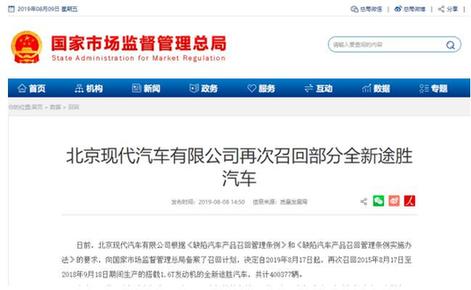 圖為北京全新途勝再次召回的召回信息(圖片來源:國家市場監(jiān)督管理總局官網(wǎng))