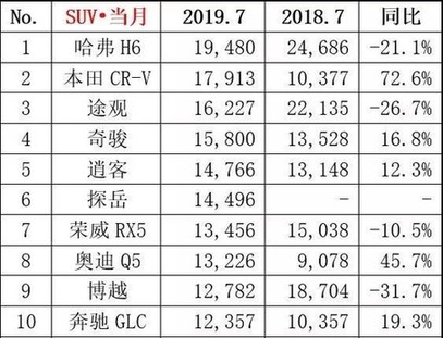 2019年7月SUV銷量排名(圖片來自乘用車市場信息聯(lián)席會)