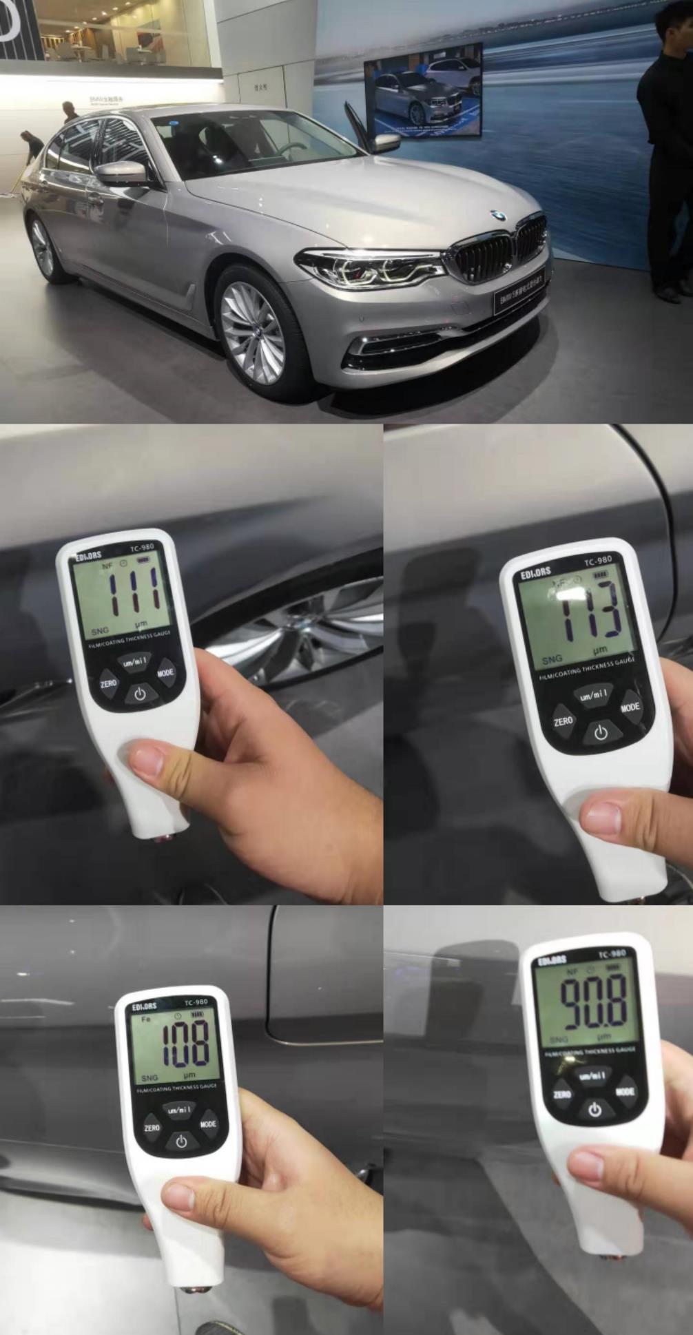 針對寶馬530Le車身漆面測試,除右后葉子板外均顯示“NF”非鐵基(徐天允 攝)