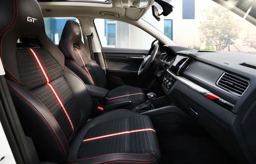 其家族式直瀑式進氣格柵再度進化,懸浮式立體六邊盾型格柵鍍鉻邊框造型凸顯動感氣勢。側(cè)面,雕刻般的三維立體腰線連接前后燈組,配合側(cè)面凌厲的17吋刀斧式5輻輪轂極具時尚潮范。而在“魔力紅”的旗艦版柯米克GT車內(nèi),也隨處可見紅色元素的點綴,盡顯動感潮酷氛圍。