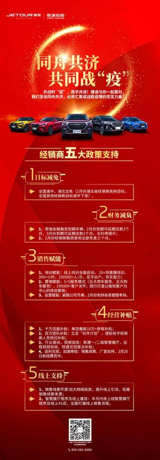 近日,新型冠狀病毒感染的肺炎疫情,牽動(dòng)全國(guó)億萬(wàn)百姓揪著的心,也給大家的生產(chǎn)、經(jīng)營(yíng)與工作生活帶來了巨大的困難與阻礙。在過去的一年,奇瑞控股捷途產(chǎn)品序列的經(jīng)營(yíng)銷售日益攀升,節(jié)節(jié)向上,但面對(duì)突然降臨的疫情,全國(guó)的經(jīng)銷商伙伴們瞬間承受了巨大的經(jīng)營(yíng)壓力,很多都出現(xiàn)了現(xiàn)金流緊張、到店人流大幅減少、高額運(yùn)營(yíng)成本等問題。為了讓旗下經(jīng)銷商能輕裝上陣戰(zhàn)疫情,無后顧之憂的為消費(fèi)者提供更好的購(gòu)車用車體驗(yàn)。奇瑞控股捷途迅速的下定決心,將自己的肩膀與經(jīng)銷商伙伴的肩膀靠在了一起,共同扛起這份千斤重?fù)?dān)。