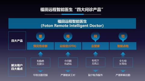 發(fā)布會(huì)現(xiàn)場,福田汽車后市場事業(yè)部總經(jīng)理代勇表示,福田汽車將依托智科車聯(lián)網(wǎng)、專家診斷系統(tǒng)、福田e家等平臺(tái)優(yōu)勢,通過預(yù)見性診斷、云標(biāo)定(OTA)服務(wù)、云管家、智能點(diǎn)檢等服務(wù)產(chǎn)品,為用戶提供最貼心的商用車遠(yuǎn)程智能醫(yī)生。