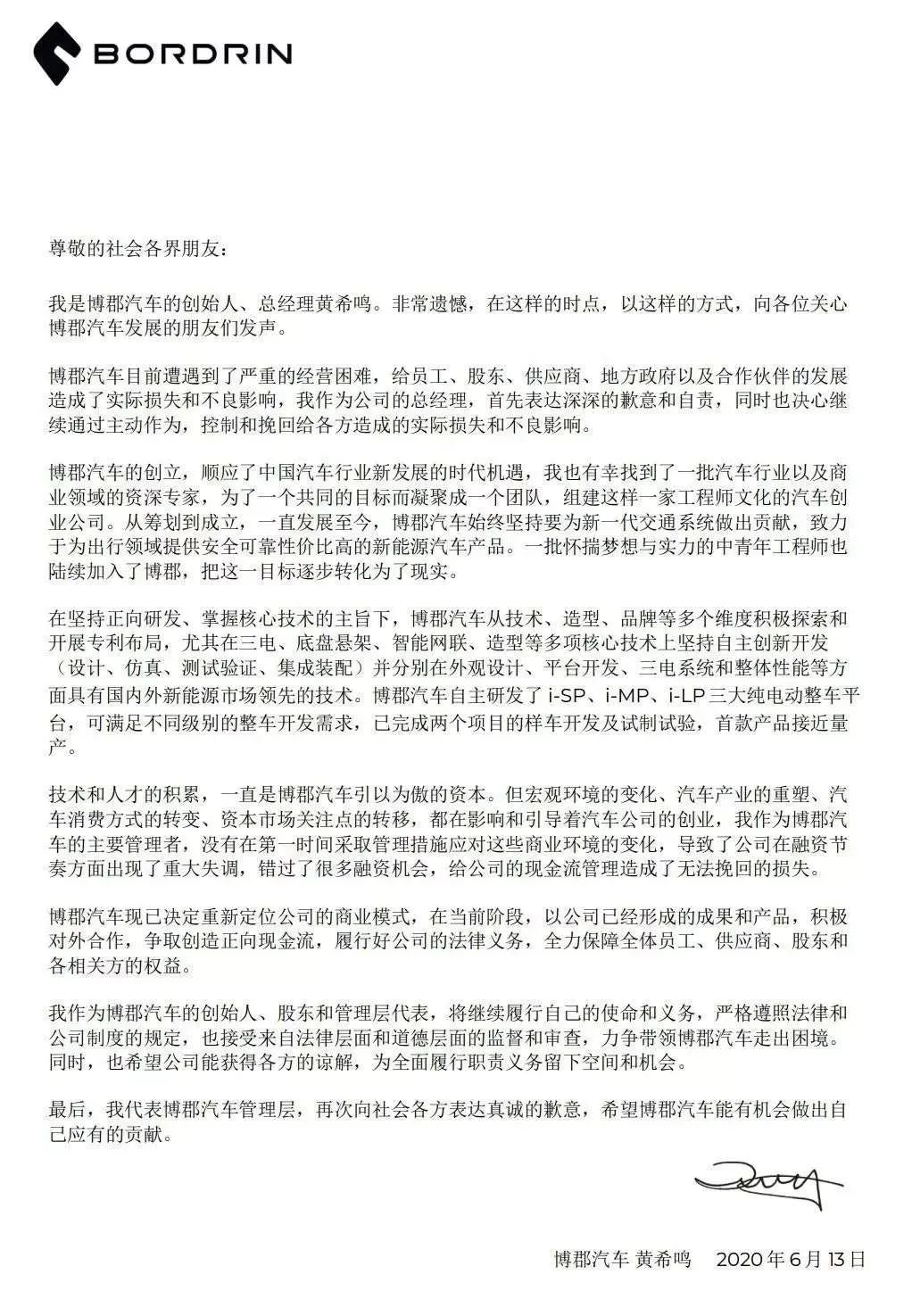 據(jù)悉,6月10日,博郡汽車召開了一場總監(jiān)級別以上的內(nèi)部會議,博郡汽車創(chuàng)始人黃希鳴、副總裁李瑛、CFO易曉川等高管參加,宣布將由人力資源總監(jiān)張暢牽頭成立新公司,黃希鳴表示,新公司將是目前唯一的自救路徑。新公司成立預(yù)計(jì)需要300名左右員工,將按照自愿原則與博郡員工重新簽訂合同,按時(shí)發(fā)放工資,但并非所有人員都會一并納入新公司,但這一消息未得到官方證實(shí)。