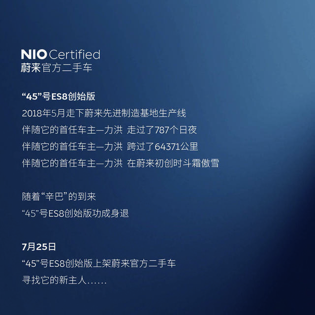 作為蔚來元老級人物,秦力洪將其名下的“45號”ES8創(chuàng)始版作為二手車進行銷售,并掛在蔚來商城的焦點圖上作為宣傳。7月25日,其汽車商城掛出了“45號”ES8創(chuàng)始版。該車2018年5月走下蔚來制造基地生產(chǎn)線,伴隨它的首任車主-力洪,走過了787個日夜,跨過64371公里,在蔚來初創(chuàng)時“斗霜傲雪”,如今“辛巴”到來,“45號”ES8創(chuàng)始版也功成身退,來到蔚來官方二手車尋找新主人。