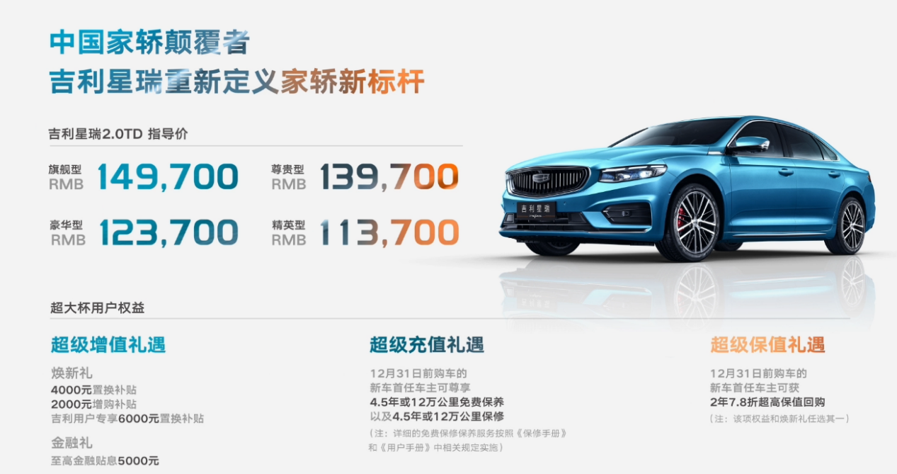 在優(yōu)惠政策方面,吉利推出了超大杯用戶權(quán)益,可享三重禮遇,其中超級增值禮遇包括4000元置換補(bǔ)貼、2000元增購補(bǔ)貼、吉利用戶專享6000元置換補(bǔ)貼、金融貼息5000元;超級充值禮遇包括12月31日前購車的新車首任車主可享4.5年或12萬公里免費(fèi)保養(yǎng)及4.5年或12萬公里保修;超級保值禮遇包括12月31日前購車的新車首任車主可獲2年7.8折保值回購。