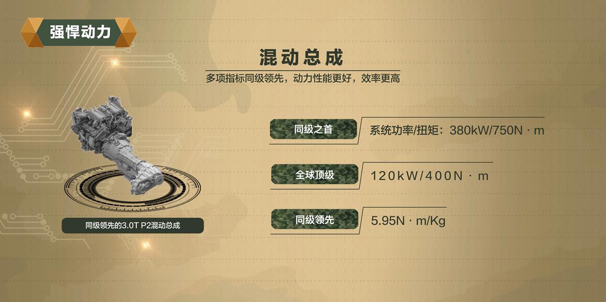 動力方面,坦克平臺涵蓋ICE、PHEV、HEV三種動力形式,常規(guī)高效發(fā)動機實現了38%的發(fā)動機熱效率。匹配縱置9AT變速器,扭矩密度和齒比跨度同級領先,實現了重量更輕、動力性能更好、效率更高。坦克平臺的3.0GDIT+ 9AT P2的動力組合動力非常強勁,最大功率為380kW,峰值扭矩可達750N·m,保障其越野需求。