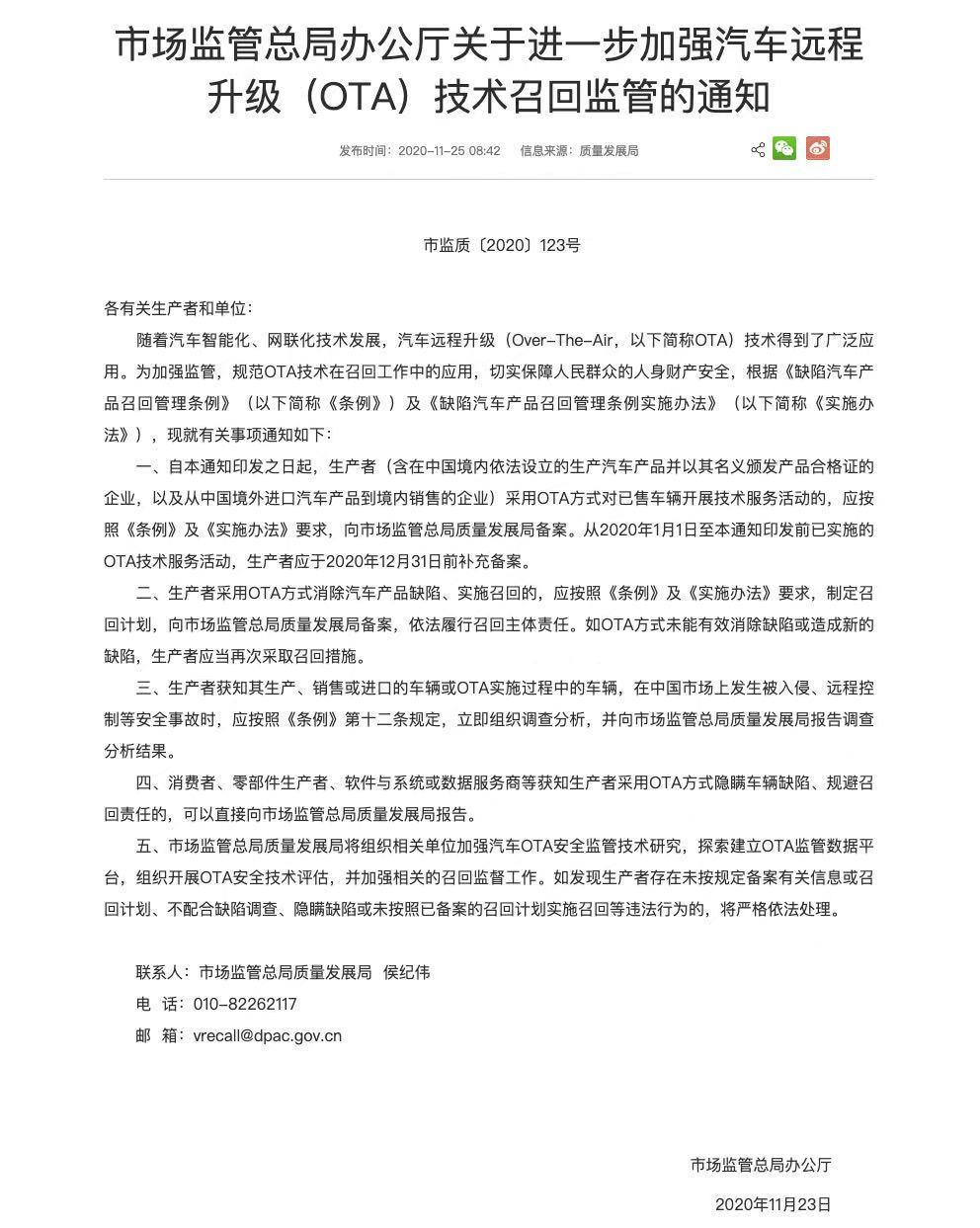 11月25日,國家市場監(jiān)管總局辦公廳發(fā)布了《關(guān)于進(jìn)一步加強(qiáng)汽車遠(yuǎn)程升級(OTA)技術(shù)召回監(jiān)管的通知》(以下簡稱《通知》)。《通知》指出,不管企業(yè)是以O(shè)TA作為召回措施還是技術(shù)服務(wù)活動,都要履行備案的義務(wù)。就《通知》內(nèi)容,中國質(zhì)量新聞網(wǎng)汽車資訊進(jìn)行了解讀。
