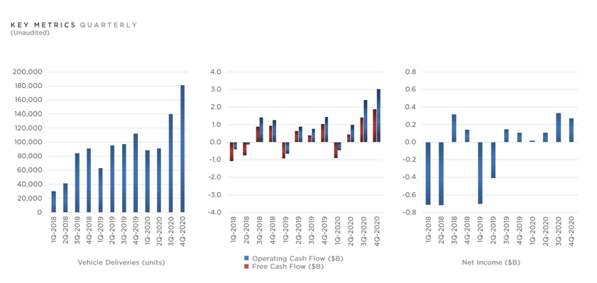 2020年最后一個(gè)季度,特斯拉營(yíng)收達(dá)107.74億美元(約700億元人民幣),同比上漲46%,超出市場(chǎng)預(yù)期的104億美元(約675億元人民幣);毛利潤(rùn)為20.66億美元(約134億元人民幣),同比增長(zhǎng)49%;調(diào)整后息稅前利潤(rùn)為18.5億美元(約120億元人民幣),同比增長(zhǎng)為57%;歸屬于普通股股東的凈利潤(rùn)為2.7億美元(約18億元人民幣),同比增長(zhǎng)157%;歸屬于普通股東的每股收益為0.24美元(約1.6元人民幣),同比增長(zhǎng)118%;自由現(xiàn)金流為18.68億美元(約121億元人民幣),同比增長(zhǎng)84%。