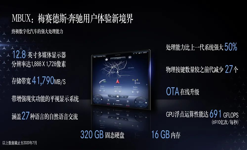 以英偉達(dá)Xavier芯片、8核CPU、512核GPU以及16GB DDR4高頻內(nèi)存為基礎(chǔ),以強(qiáng)大的算力確保了MBUX在擁有細(xì)膩交互界面品質(zhì)和豐富功能的同時運行流暢,并支持OTA在線升級。