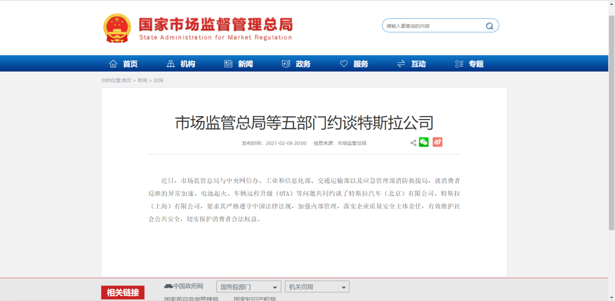 2月8日晚間,國家市場監(jiān)督管理總局與中央網信辦、工業(yè)和信息化部、交通運輸部以及應急管理部消防救援局,就消費者反映的異常加速、電池起火、車輛遠程升級(OTA)等問題共同約談特斯拉汽車(北京)有限公司、特斯拉(上海)有限公司,要求其嚴格遵守中國法律法規(guī),加強內部管理,落實企業(yè)質量安全主體責任,有效維護社會公共安全,切實保護消費者合法權益。