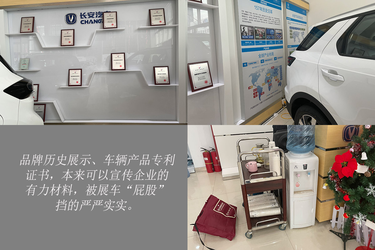 無論是外觀還是內(nèi)里,都可以看出這家門店展廳并不大,布局可以用緊密來形容,都將展廳后的長(zhǎng)安歷史、長(zhǎng)安汽車專利等需要展示的遮擋了起來。當(dāng)然這與長(zhǎng)安的車系太多有關(guān),想全部放下,需要更大的展廳。