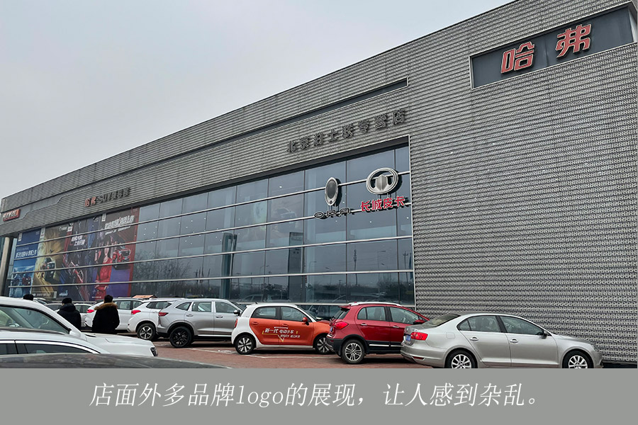 可以看出長(zhǎng)城汽車與長(zhǎng)安、吉利的不同是多品牌集中銷售,所以在深灰色的外觀上并沒有突出長(zhǎng)城汽車,而是分別標(biāo)出哈弗、歐拉和長(zhǎng)城皮卡等品牌。