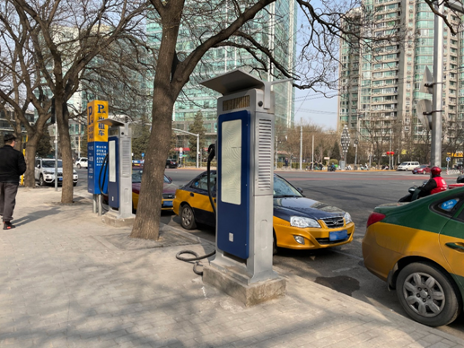 走訪中,筆者發(fā)現(xiàn)北京出租車專用路邊充電站多是兩臺直流充電樁,地理位置大都處于鬧市區(qū)。順著北京四環(huán)輔路進行沿途考察,看到這些充電站不是在關(guān)閉狀態(tài),就是被其它燃油車占用。