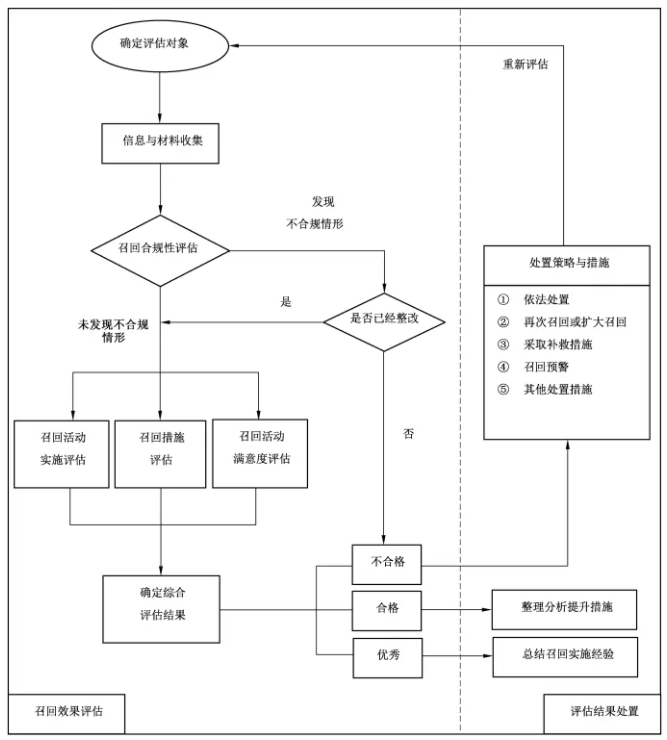 6. 召回效果評估過程。包括確定評估對象、信息與材料收集、召回合規(guī)性評估、召回活動實(shí)施評估、召回措施評估、召回活動滿意度評估和確定召回效果綜合評估結(jié)果。