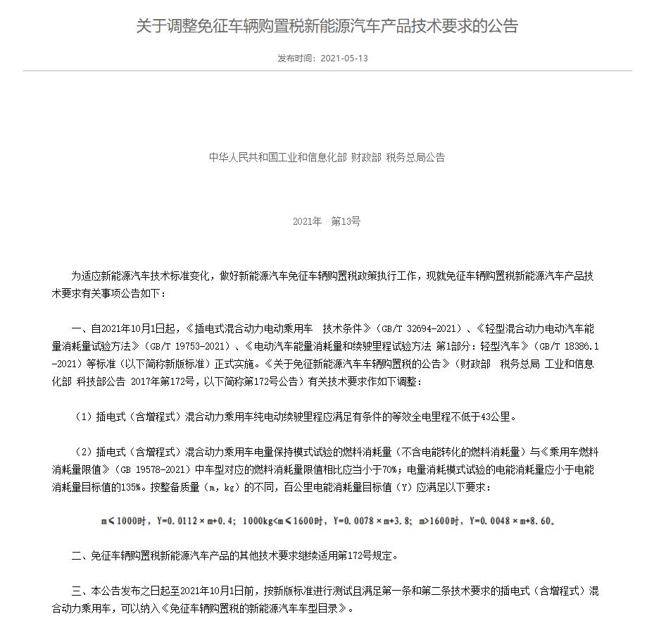 中國質(zhì)量新聞網(wǎng)訊 (張陽)近日,為適應(yīng)新能源汽車技術(shù)標(biāo)準(zhǔn)變化,做好新能源汽車免征車輛購置稅政策執(zhí)行工作,工信部、財(cái)政部、稅務(wù)總局聯(lián)合發(fā)布了《關(guān)于調(diào)整免征車輛購置稅新能源汽車產(chǎn)品技術(shù)要求的公告》(以下簡稱公告),自2021年10月1日起,插電式(含增程式)混合動(dòng)力乘用車純電動(dòng)續(xù)駛里程應(yīng)滿足有條件的等效全電里程不低于43公里。