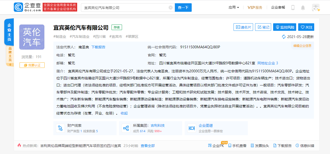 中國(guó)質(zhì)量新聞網(wǎng)訊(安宇航) 據(jù)企查查顯示,5月27日,宜賓英倫汽車有限公司正式成立,該公司由宜賓英倫新能源汽車科技有限公司100%持股,后者由浙江吉利控股集團(tuán)有限公司全資控股。