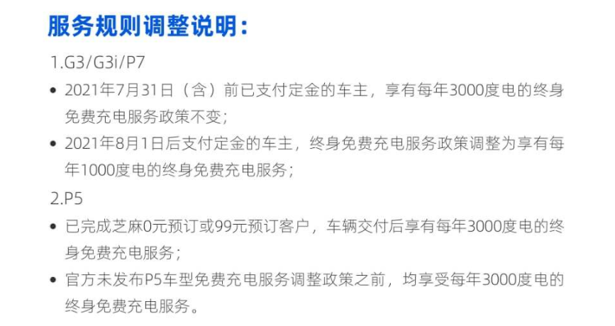 根據(jù)官方發(fā)布的公告來(lái)看,2021年7月31日(含)前已支付定金的車主,依然享有每年3000度電的終身免費(fèi)充電服務(wù)政策,車型包含小鵬G3、G3i和P7;而在2021年8月1日后支付定金的車主,終身免費(fèi)充電服務(wù)政策調(diào)整為享有每年1000度電。