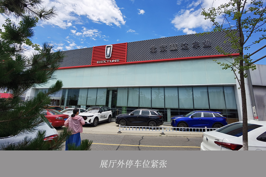 緊接著,筆者一行人驅(qū)車趕往了位于密云區(qū)的一汽奔騰經(jīng)銷商,從圖片可以看出,該展廳的門前停滿了試駕車輛,客戶只能將車停放在路邊,停車場設(shè)計(jì)得不太合理。