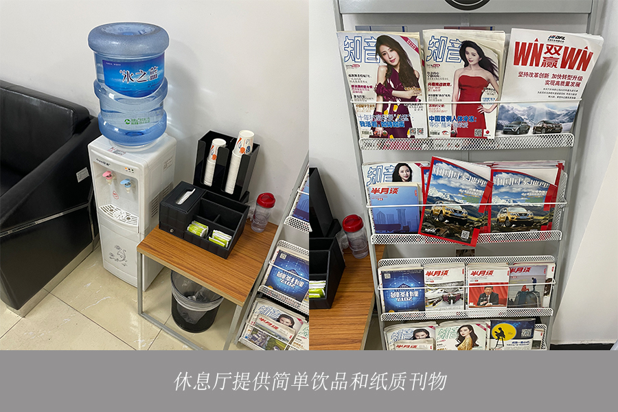 該展廳后方設(shè)置了客戶休息區(qū)域,提供了飲水機(jī)、茶葉包與可樂,并且設(shè)置了雜志讀物、電視機(jī)和五子棋等簡單的設(shè)施可供等待維修保養(yǎng)的客戶打發(fā)時(shí)間。