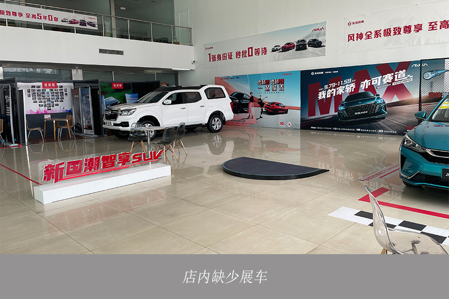 離開奇瑞展廳后,筆者一行人來到了同園區(qū)的東風(fēng)風(fēng)神經(jīng)銷商展廳,該家經(jīng)銷商除東風(fēng)風(fēng)神外,同時(shí)還銷售鄭州日產(chǎn)的產(chǎn)品。展廳外停車場十分寬敞,但門口停放較多剛到店的新車,占用了部分空間,相較于奔騰和奇瑞的兩家經(jīng)銷商,尋找停車位稍容易些。