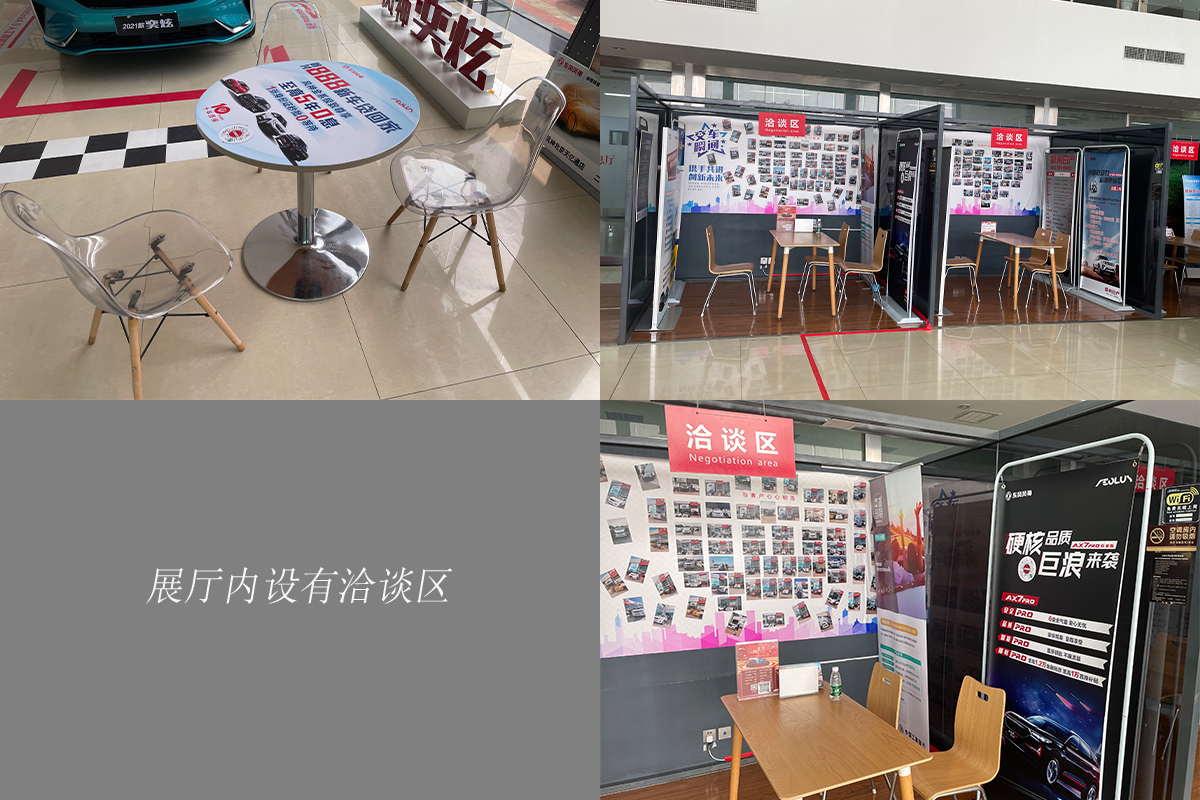 該店在展廳設(shè)有三處洽談區(qū),墻面上張貼著品牌相關(guān)的照片,旁邊還設(shè)有相關(guān)產(chǎn)品的易拉寶進(jìn)行展示。