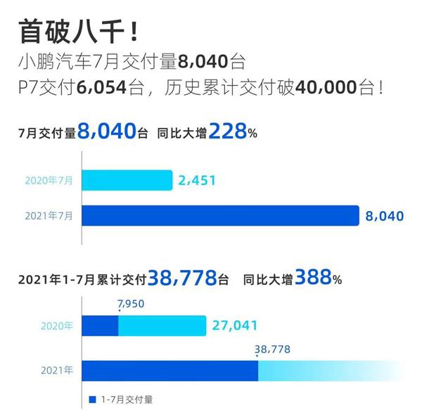 同樣單月銷(xiāo)量首次超過(guò)八千的還有小鵬汽車(chē),7月售出8040輛,同比增長(zhǎng)228%,再次刷新了歷史月交付紀(jì)錄。從車(chē)型來(lái)看,主要銷(xiāo)量貢獻(xiàn)者是小鵬P7,7月交付了6054輛,并且連續(xù)幾個(gè)月進(jìn)行了自我突破,不斷刷新單車(chē)型銷(xiāo)售紀(jì)錄。