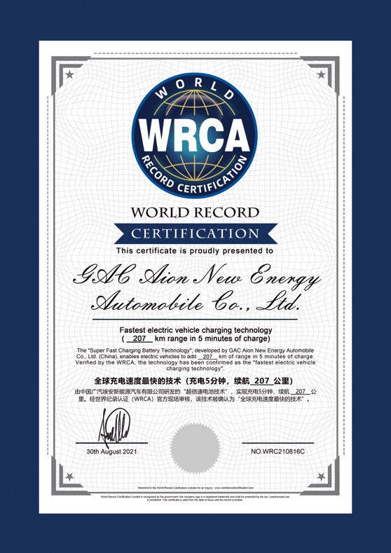在發(fā)布會當(dāng)天舉行的“全球充電速度世界紀錄挑戰(zhàn)”全網(wǎng)直播活動中,搭載超倍速電池技術(shù)的AION車型,在世界紀錄認證官的公證下,取得了充電5分鐘,全程行駛207公里的亮眼成績,一舉創(chuàng)下純電動車有史以來的充電速度世界紀錄。
