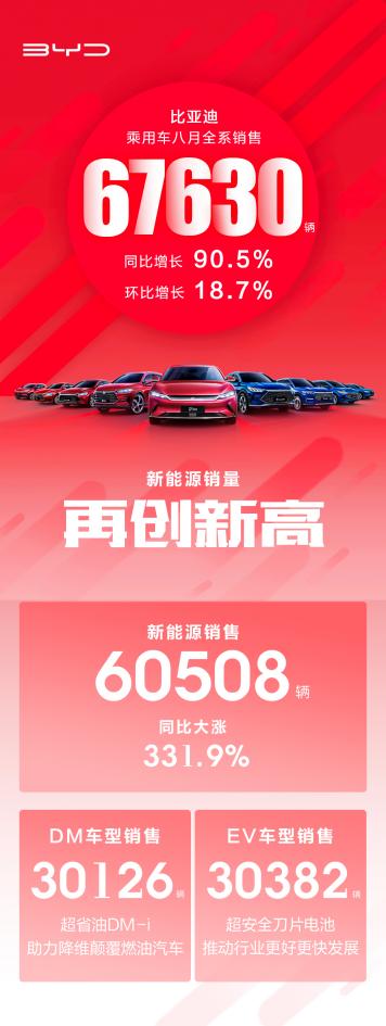 而在上周五,比亞迪官方發(fā)布了8月的新車(chē)銷量數(shù)據(jù)。全系銷量67630輛,同比增長(zhǎng)90.5%,環(huán)比增長(zhǎng)18.7%。連續(xù)六個(gè)月實(shí)現(xiàn)銷量同比、環(huán)比雙增長(zhǎng)。其中,新能源乘用車(chē)銷售60508輛,同比增長(zhǎng)331.9%,再次刷新銷量紀(jì)錄。