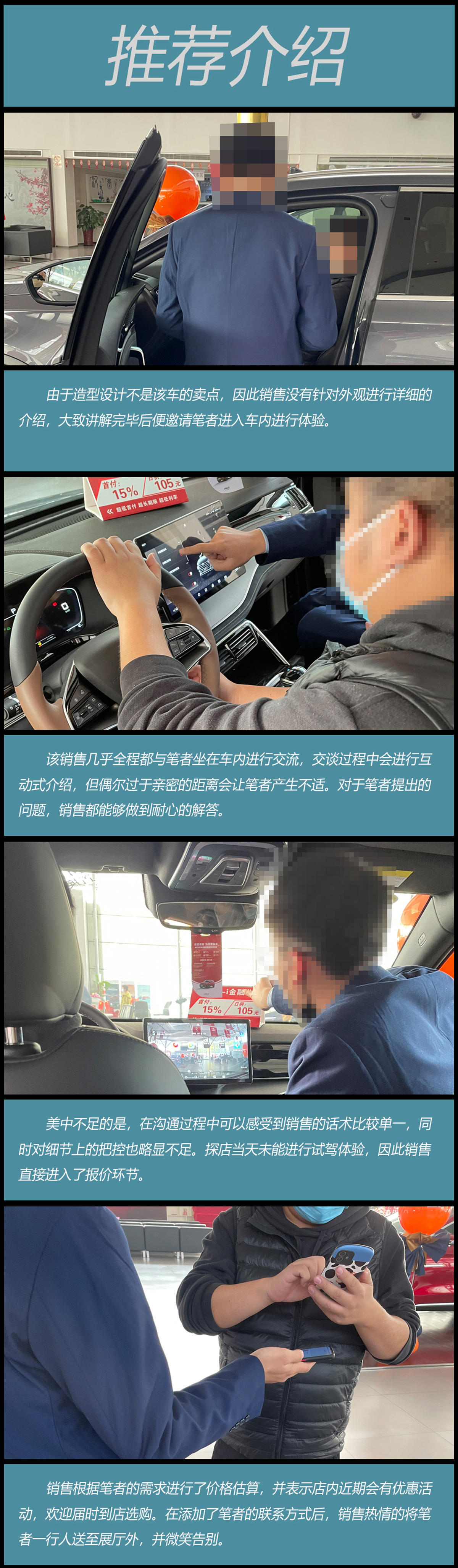 小結(jié):該家經(jīng)銷商無論是前臺(tái)接待速度還是銷售的服務(wù)態(tài)度都給筆者留下了較好的印象,但是在細(xì)節(jié)方面,例如進(jìn)入停車場(chǎng)后沒有人員指引、介紹過程中與筆者過于親密,主動(dòng)服務(wù)性以及配套設(shè)施方面在一定程度上拉低了分?jǐn)?shù)。