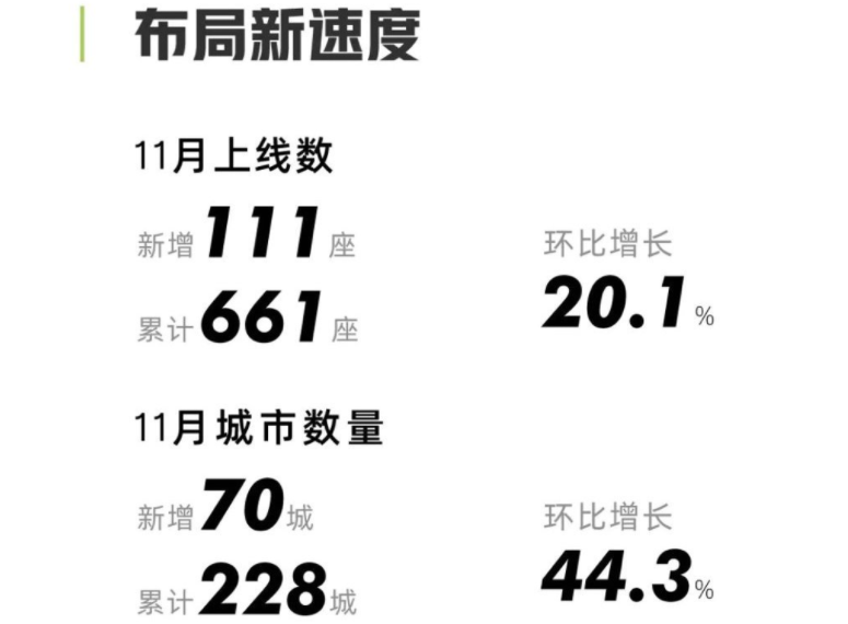 中國質(zhì)量新聞網(wǎng)訊(劉嘉運)小鵬汽車近日披露,今年11月份,小鵬共上線111座超充站,環(huán)比增長20.1%,累計建成超充站661座。同時,截至11月底,2021年小鵬超充站覆蓋城市數(shù)量新增70城,環(huán)比增長44.3%,累計達228城。