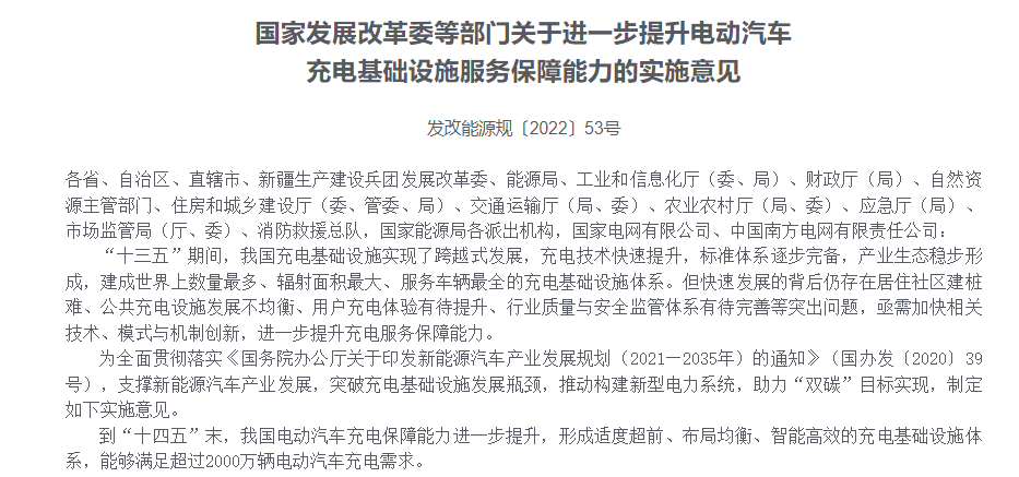 中國質(zhì)量新聞網(wǎng)訊(張陽)近日,國家發(fā)展改革委等十部門聯(lián)合印發(fā)《關(guān)于進(jìn)一步提升電動汽車充電基礎(chǔ)設(shè)施服務(wù)保障能力的實(shí)施意見》,明確到“十四五”末,我國電動汽車充電保障能力進(jìn)一步提升,形成適度超前、布局均衡、智能高效的充電基礎(chǔ)設(shè)施體系,能夠滿足超過2000萬輛電動汽車充電需求。