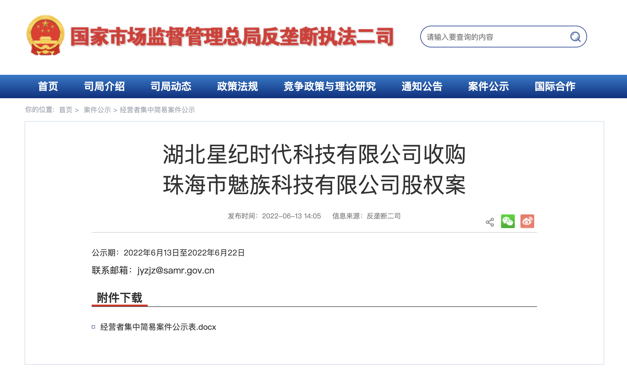 中國質量新聞網(wǎng)訊(余昶)6月13日消息,國家市場監(jiān)督管理總局反壟斷執(zhí)法二司發(fā)布湖北星紀時代科技有限公司(以下簡稱星紀時代)收購珠海市魅族科技有限公司(以下簡稱珠海魅族)股權案公示信息。根據(jù)公示信息,星紀時代已與魅族以及涉及交易的股東簽署協(xié)議,星紀時代擬收購珠海魅族79.09%的股權。