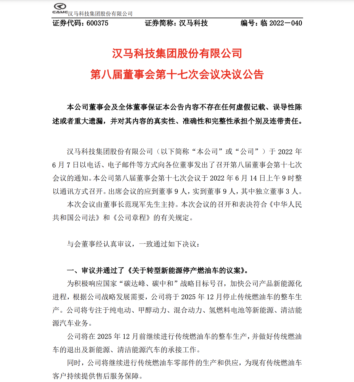 中國(guó)質(zhì)量新聞網(wǎng)訊(余昶)6月14日,漢馬科技發(fā)布公告稱,為積極響應(yīng)國(guó)家號(hào)召,加快公司產(chǎn)品新能源化進(jìn)程,公司將于2025年12月停止傳統(tǒng)燃油車的整車生產(chǎn)。公司將專注于純電動(dòng)、甲醇動(dòng)力、混合動(dòng)力、氫燃料電池等新能源、清潔能源汽車業(yè)務(wù)。