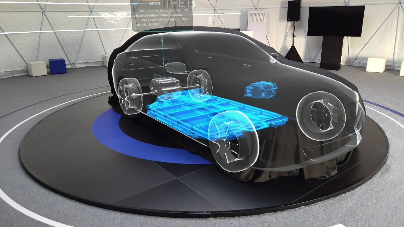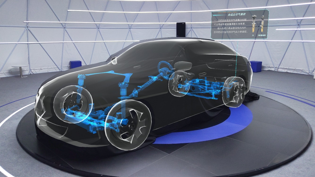 筆者對(duì)全新BMW i3的體驗(yàn)是從“看穿”它開(kāi)始的:戴上MR眼鏡,筆者看到一輛寶馬車,當(dāng)筆者跟著提示伸出手指點(diǎn)擊眼前虛擬屏幕的時(shí)候,寶馬的鋼鐵外衣瞬間消失,出現(xiàn)了汽車結(jié)構(gòu)三維透視畫面,原本看不見(jiàn)的底盤部件一覽無(wú)余。