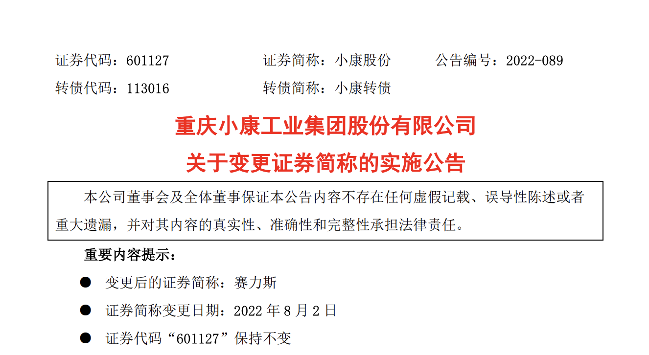 中國質(zhì)量新聞網(wǎng)訊(余昶)7月27日晚間,小康股份發(fā)布公告稱,公司證券簡稱將于8月2日由“小康股份”變更為“賽力斯”,公司證券代碼保持不變。