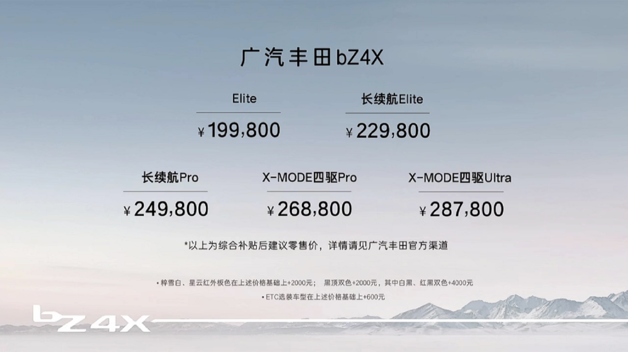 中國質(zhì)量新聞網(wǎng)訊(張陽)10月10日,廣汽豐田旗下首款e-TNGA純電中型SUV bZ4X正式上市,新車共推出五款車型,綜合補貼后售價為19.98萬元-28.78萬元。據(jù)了解,bZ4X誕生于廣汽豐田“零缺陷率”全球模范工廠,采用基于e-TNGA架構(gòu)的BEV專屬平臺打造,可提供兩驅(qū)及四驅(qū)兩種驅(qū)動形式,CLTC工況下續(xù)航里程可達615km。