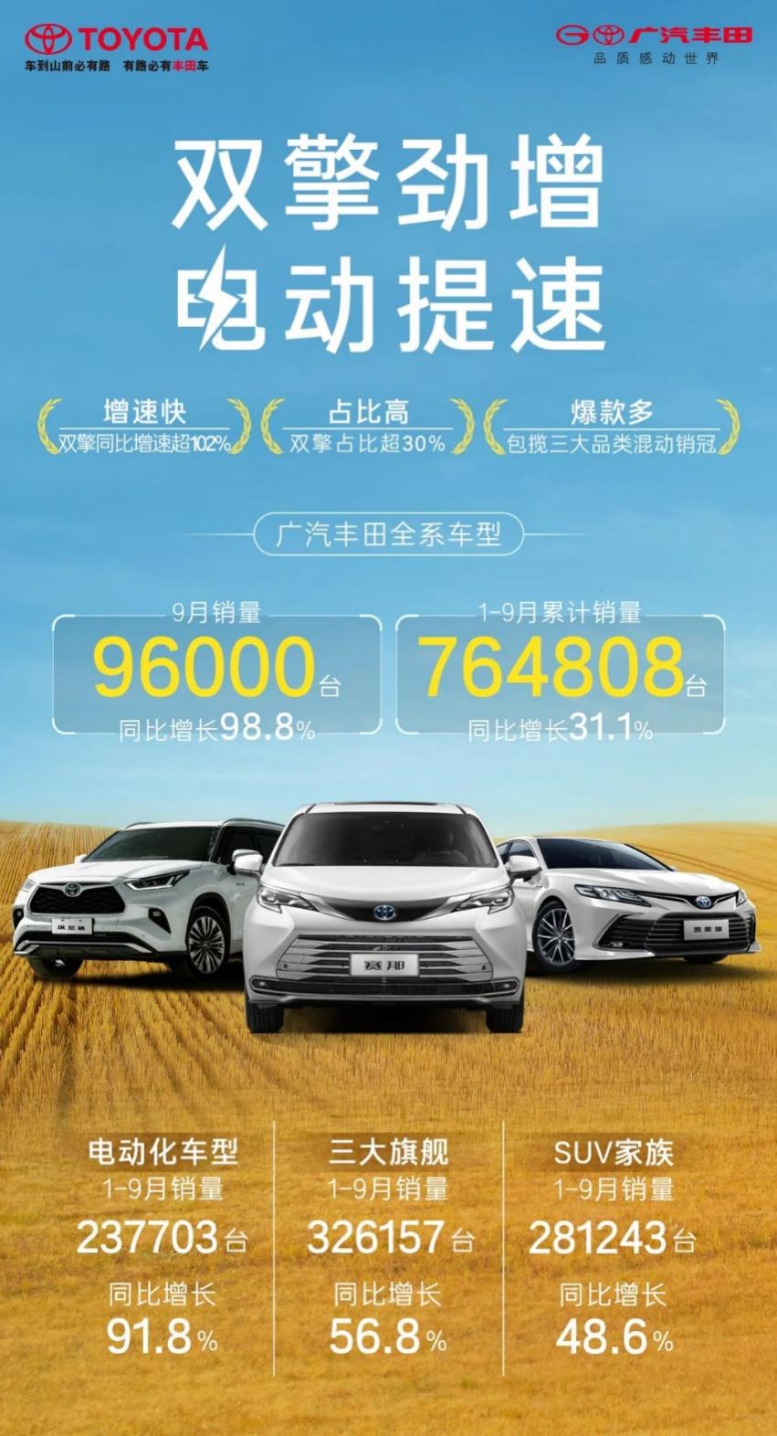 中國質(zhì)量新聞網(wǎng)訊(張陽)日前,乘聯(lián)會(huì)正式公布9月銷量,廣汽豐田憑借電動(dòng)化和高端化雙核發(fā)力,在第三季度交出令人滿意的成績單,穩(wěn)居合資頭部陣營。9月批發(fā)銷量96000臺(tái),同比增長98.8%;1-9月累計(jì)批發(fā)銷量764808臺(tái),同比增長31.1%,銷量增速領(lǐng)跑主流合資車企。廣汽豐田前三季度的強(qiáng)勁表現(xiàn),將助力第四季度向“年產(chǎn)銷百萬臺(tái)”的目標(biāo)發(fā)起沖刺。