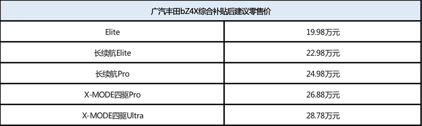 當(dāng)前,廣汽豐田提速全方位電動(dòng)化戰(zhàn)略,不僅在混合動(dòng)力領(lǐng)域持續(xù)強(qiáng)化“TNGA雙擎高級(jí)混動(dòng)”優(yōu)勢,而且著力開拓純電市場。近日廣汽豐田首款e-TNGA純電中型SUV bZ4X正式上市,開啟廣汽豐田純電新紀(jì)元。新車共推出五大配置版本,綜合補(bǔ)貼后建議零售價(jià)19.98萬元-28.78萬元。廣汽豐田bZ4X將以超越以往的先端科技魅力,為用戶帶來“一秒驚艷,長久安心”的純電新體驗(yàn)。