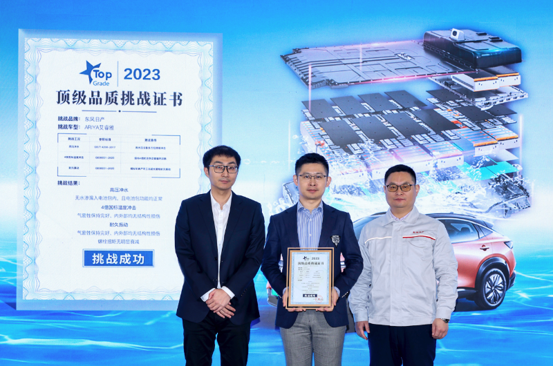 2月16日,在東風(fēng)日產(chǎn)位于武漢的新能源工廠總裝車間,中國汽車權(quán)威檢測機(jī)構(gòu)中國汽車研究中心張研,向東風(fēng)日產(chǎn)頒發(fā)了“2023年度頂級品質(zhì)挑戰(zhàn)證書”,證實(shí)搭載在東風(fēng)日產(chǎn)電動車ARIYA艾睿雅上的電池包成功地經(jīng)受了“高壓沖水、4倍于國標(biāo)溫度沖擊、耐久振動”三項(xiàng)嚴(yán)苛的安全測試考驗(yàn)。