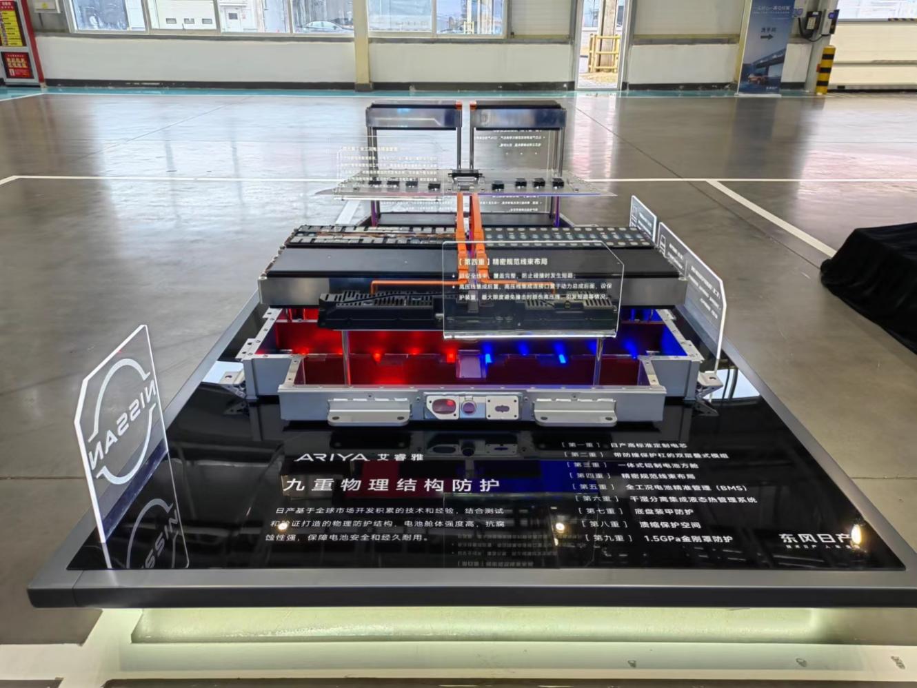 還有,透明管里流動的橙紅色液體演示著冷卻液的流動。電池包冷卻降溫“干濕分離”是東風(fēng)日產(chǎn)獨(dú)有的設(shè)計(jì),這個(gè)設(shè)計(jì)不同于業(yè)界普遍采用的整層金屬板冷卻法,避免了當(dāng)車輛被意外碰撞時(shí),冷卻液對電池包的侵蝕。