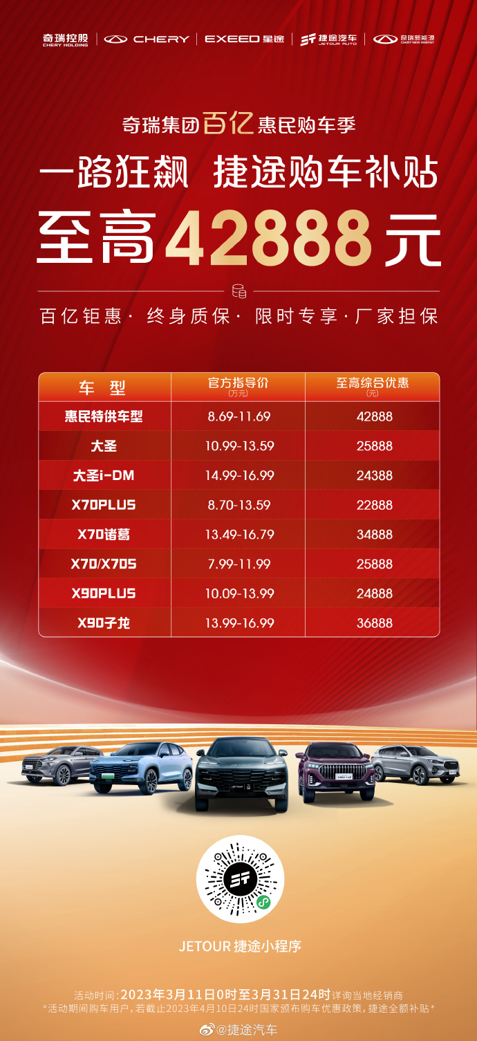 據(jù)悉,自2023年3月11日0時起至3月31日24時止,凡在此期間購買奇瑞集團全系車型的客戶,均可享受不同程度的補貼優(yōu)惠。