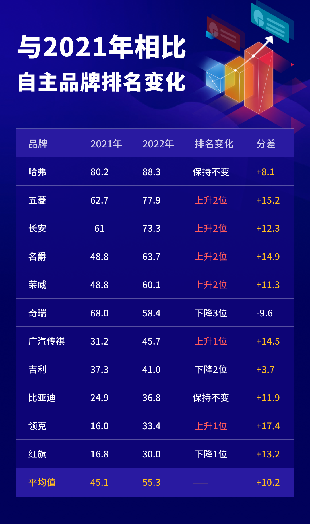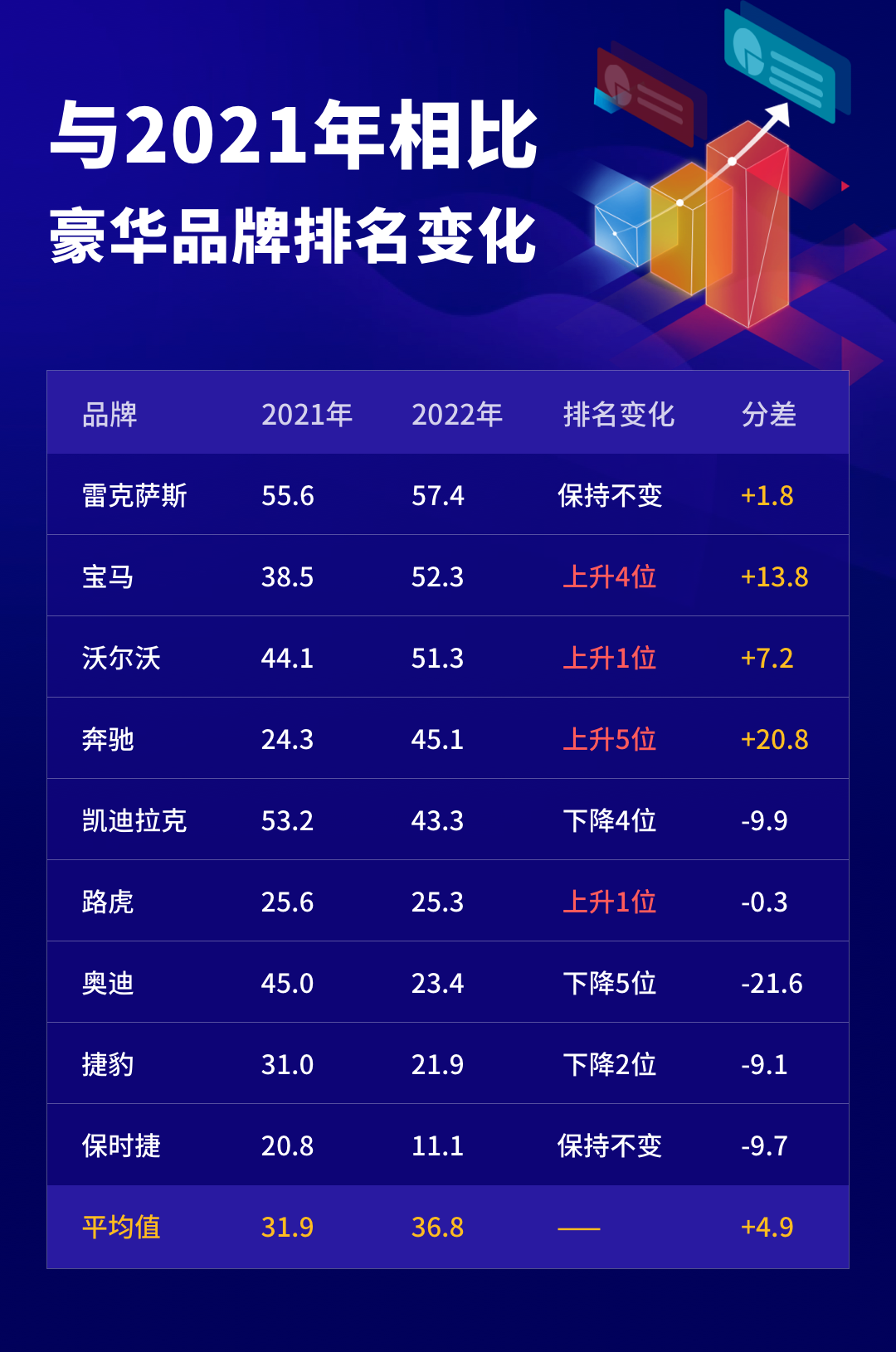 值得注意的是,不能忽略名次大幅提升的品牌。寶馬品牌上升四個臺階,直接由2021年的第五位躍升至2022年的第二位,奔馳品牌亦提升五位。奔馳品牌、寶馬品牌成為本次評價指數(shù)提升最為突出的明星品牌。