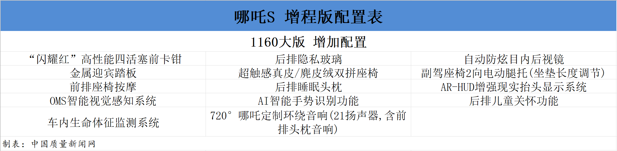 1160大版車(chē)型多了“閃耀紅”高性能四活塞前卡鉗、后排隱私玻璃、自動(dòng)防眩目?jī)?nèi)后視鏡、金屬迎賓踏板、超觸感真皮/麂皮絨雙拼座椅、副駕座椅2向電動(dòng)腿托(坐墊長(zhǎng)度調(diào)節(jié))、前排座椅按摩、后排睡眠頭枕、AR-HUD增強(qiáng)現(xiàn)實(shí)抬頭顯示系統(tǒng)、OMS智能視覺(jué)感知系統(tǒng)、AI智能手勢(shì)識(shí)別功能、后排兒童關(guān)懷功能、車(chē)內(nèi)生命體征監(jiān)測(cè)系統(tǒng)、720°哪吒定制環(huán)繞音響(21揚(yáng)聲器,含前排頭枕音響)這些配置。