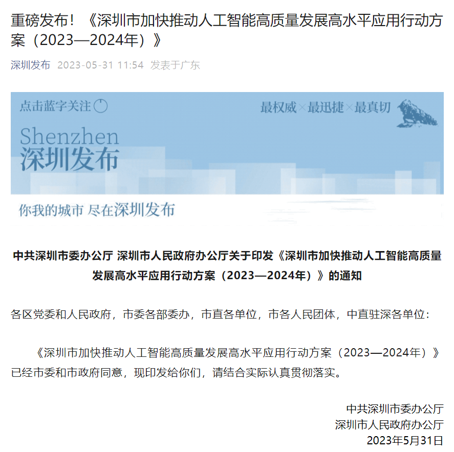 中國質(zhì)量新聞網(wǎng)訊(安宇航)5月31日,《深圳市加快推動(dòng)人工智能高質(zhì)量發(fā)展高水平應(yīng)用行動(dòng)方案(2023-2024年)》印發(fā)。