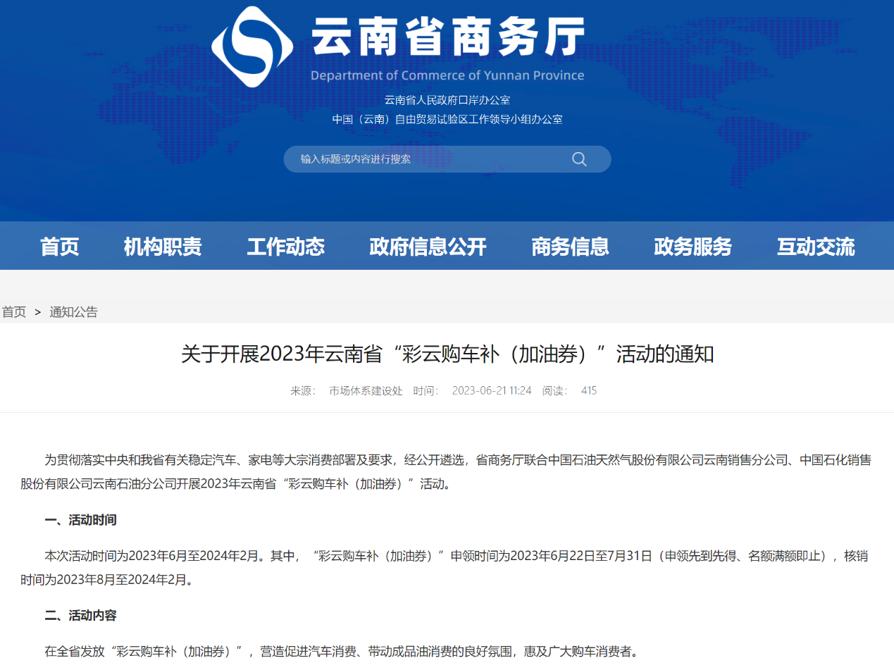 中國(guó)質(zhì)量新聞網(wǎng)訊(張陽(yáng))近日,云南省商務(wù)廳發(fā)布《關(guān)于開(kāi)展2023年云南省“彩云購(gòu)車(chē)補(bǔ)(加油券)”活動(dòng)的通知》提到,符合條件的個(gè)人消費(fèi)者可申領(lǐng)“彩云購(gòu)車(chē)補(bǔ)(加油券)”,名額共20000個(gè),總計(jì)5000萬(wàn)元。