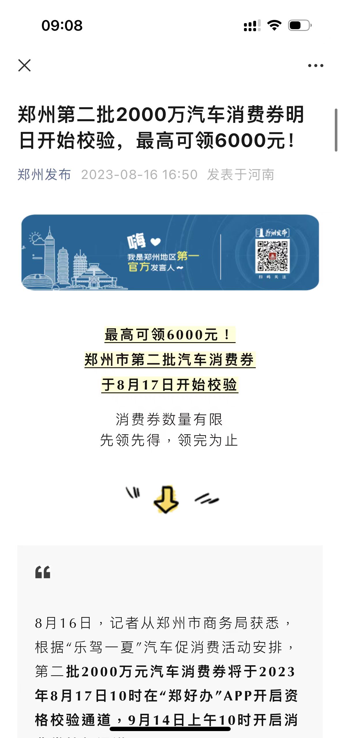 中國質量新聞網(wǎng)訊(安宇航)近日,據(jù)鄭州發(fā)布消息顯示,該市第二批2000萬元汽車消費券于8月17日在“鄭好辦”APP開啟資格校驗通道,9月14日上午10時開啟消費券搶領通道。
