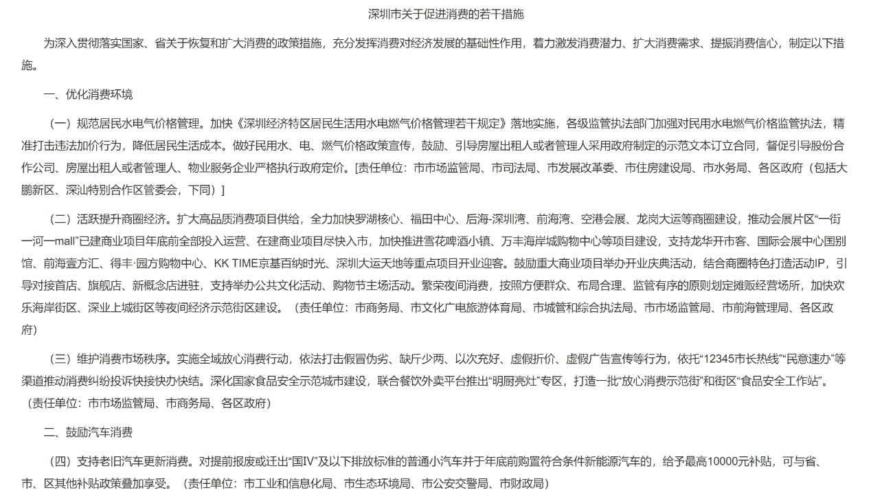 中國(guó)質(zhì)量新聞網(wǎng)訊(張陽)近日,深圳市發(fā)展改革委印發(fā)《深圳市關(guān)于促進(jìn)消費(fèi)的若干措施》。其中提到支持老舊汽車更新消費(fèi)和加大新能源汽車推廣力度,加快建設(shè)便捷高效的充電網(wǎng)絡(luò),到2024年底累計(jì)建成充電樁45萬個(gè)、超級(jí)快充站175座。